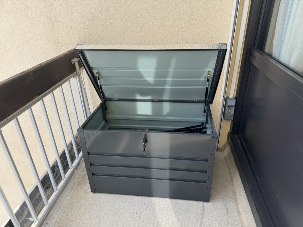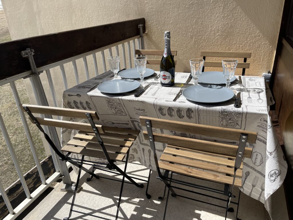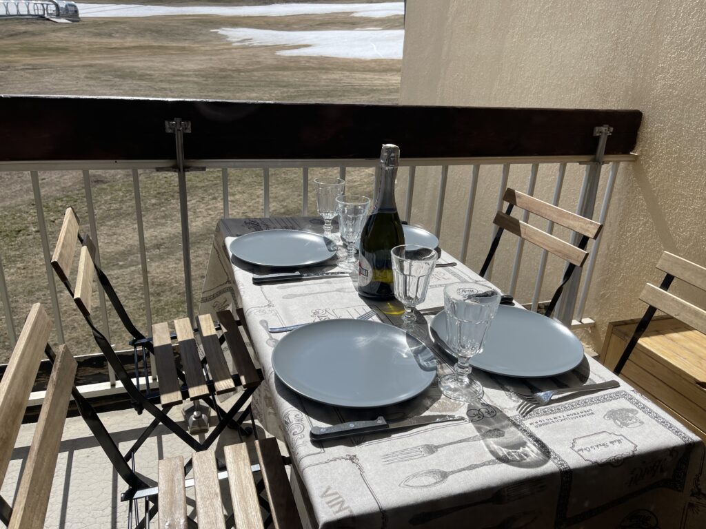Aménagé avec une table et des chaises confortables, le balcon se transforme en véritable espace de convivialité. Il permet également de libérer de l’espace à l’intérieur grâce à un coffre de rangement pratique, particulièrement utile en hiver pour stocker courses, valises ou équipements de ski. Cette fonctionnalité apporte un réel confort supplémentaire pour votre séjour à la montagne.