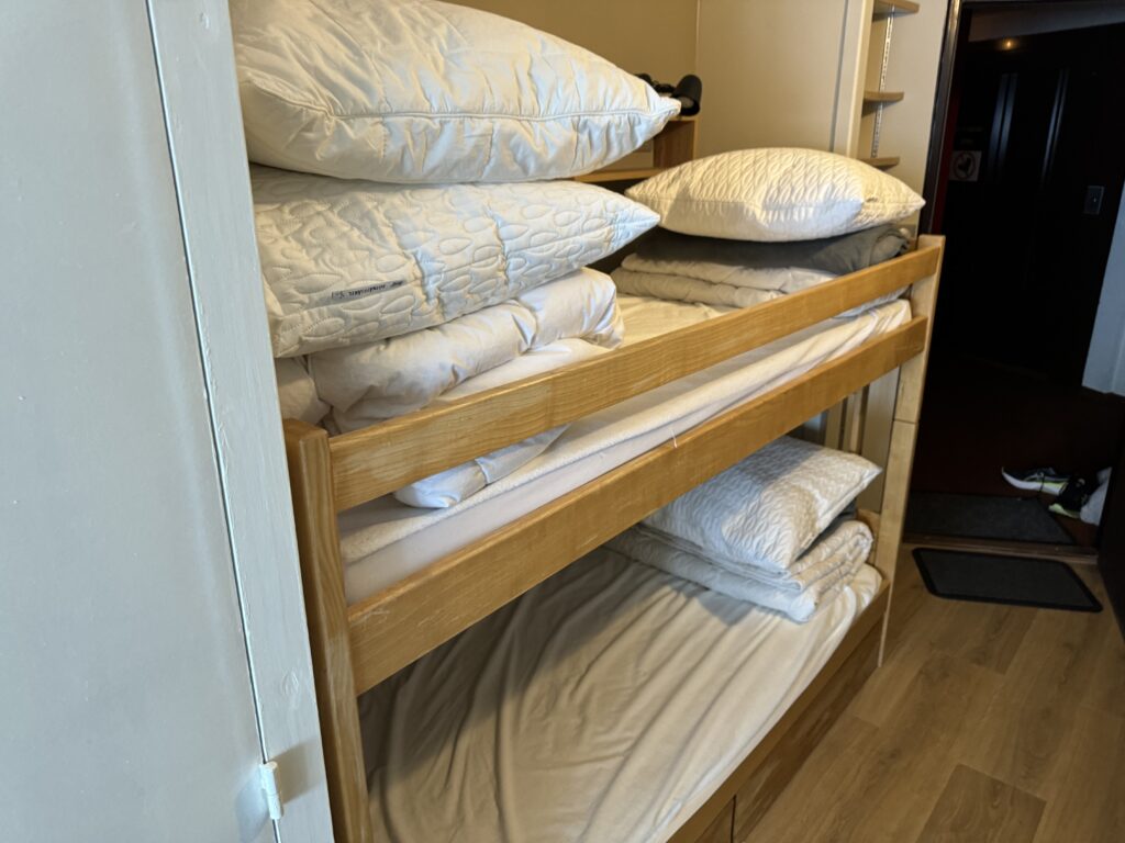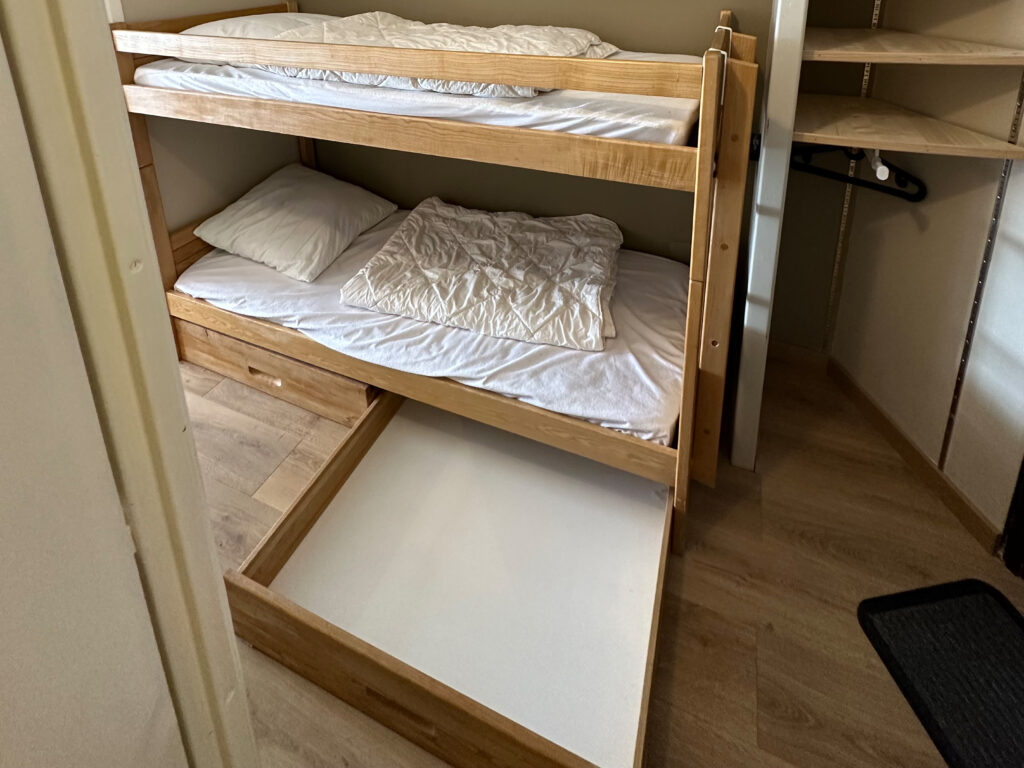 Chaque lit superposé est équipé d’un matelas de qualité hôtelière mesurant 90 x 200 cm, sélectionné pour assurer un excellent maintien et un sommeil réparateur. Afin d’augmenter encore le confort, nous mettons à disposition des couettes supplémentaires en duvet ainsi que deux oreillers en plumes d’oie de 65 x 65 cm, offrant une literie douce et agréable.