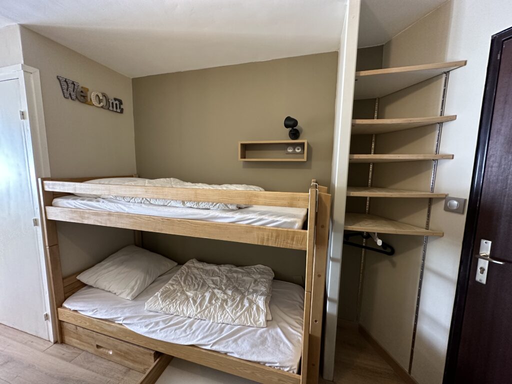 L’accès au lit supérieur se fait grâce à une échelle discrète et sécurisée. L’agencement des lits a été pensé pour optimiser l’espace tout en préservant le confort et la liberté de mouvement dans la pièce. Sous les lits, deux grands coffres de rangement permettent de stocker valises, sacs ou équipements de ski, évitant ainsi l’encombrement dans le reste de l’appartement.