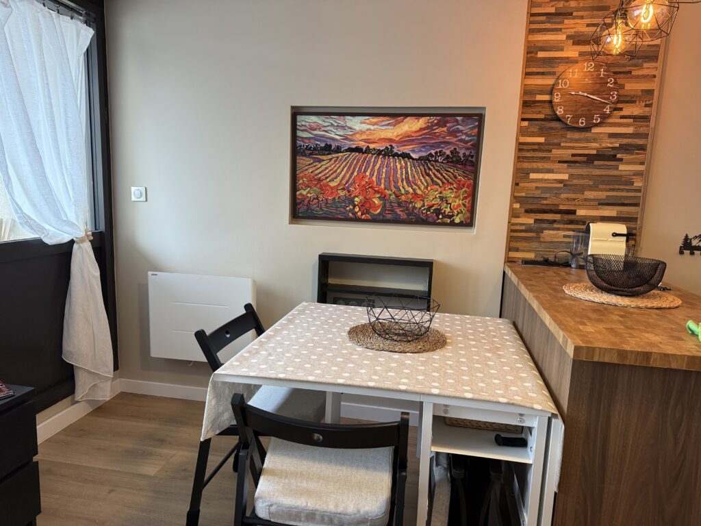 Côté aménagement, le studio dispose de rangements discrets et spacieux permettant d’organiser facilement vos affaires personnelles ou votre matériel de ski. Une table extensible accompagnée de chaises confortables permet d’accueillir jusqu’à six convives, idéale pour des repas conviviaux en famille ou entre amis.