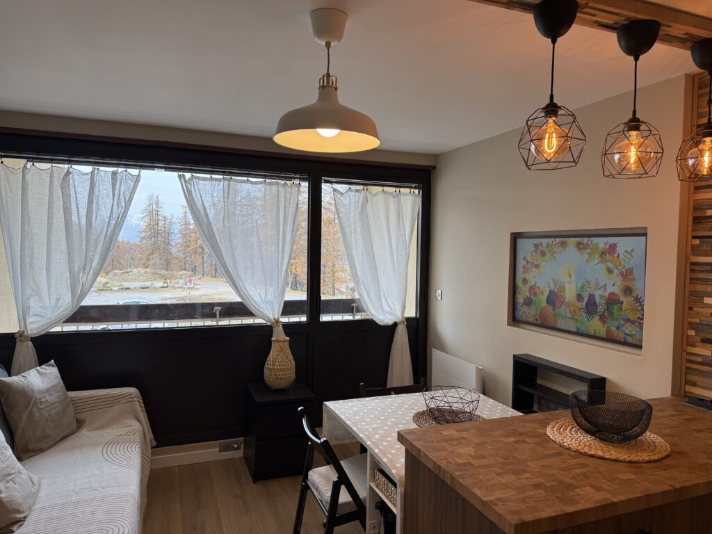 L’un des grands atouts de ce studio reste sa vue panoramique sur les montagnes environnantes. Depuis les grandes fenêtres, vous pourrez admirer les sommets enneigés en hiver ou les paysages verdoyants en été, créant une véritable invitation à la contemplation. Que ce soit au réveil ou en fin de journée, ce panorama spectaculaire contribue à rendre votre séjour unique.