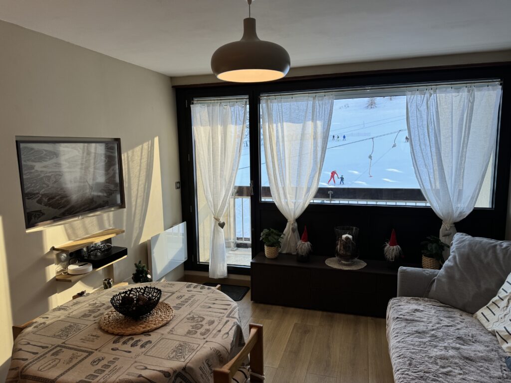 L’agencement du salon privilégie également le côté pratique avec des rangements astucieux permettant de stocker vos affaires personnelles et votre matériel de ski. Une table à manger extensible accompagne quatre chaises confortables et peut accueillir jusqu’à six convives, parfaite pour des repas conviviaux après une journée bien remplie.